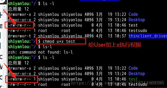 將文件夾或文件test的擁有者修改成shiyanlou,所屬的組修改成shiyanlou,如下圖: