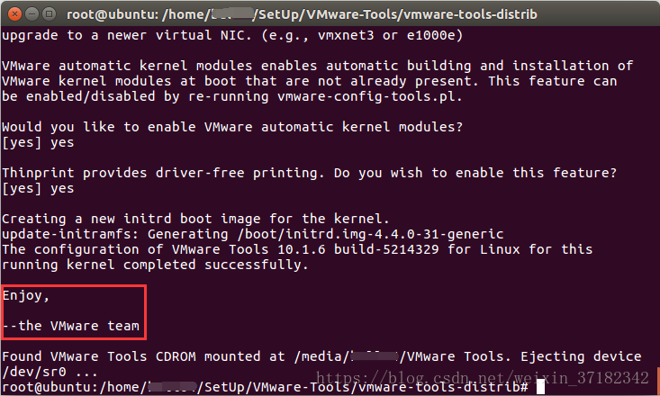7、上面的操作后就開始安裝VMware Tools了,根據其提示輸入yes/no,直到出現Enjoy, –the VMware team如下圖,就表示安裝成功了,然后手動重啟虛擬機。