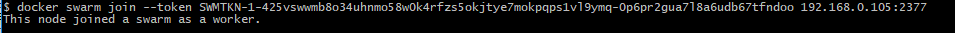docker swarm join --token SWMTKN-1-425vswwmb8o34uhnmo58w0k4rfzs5okjtye7mokpqps1vl9ymq-0p6pr2gua7l8a6udb67tfndoo 192.168.0.105:2377