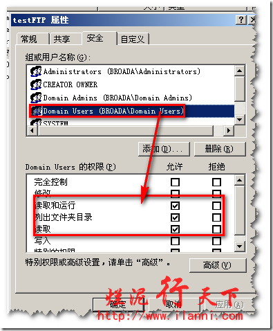 也許你會問,此圖中怎么沒有看到單獨的用戶訪問權限呢?那是因為圖中的“二線部”是一個組,這個就是AD中的一個組了。上圖中權限是只要是AD的二線部組中的所有成員都可以對目錄“二線部”進行相關的操作。