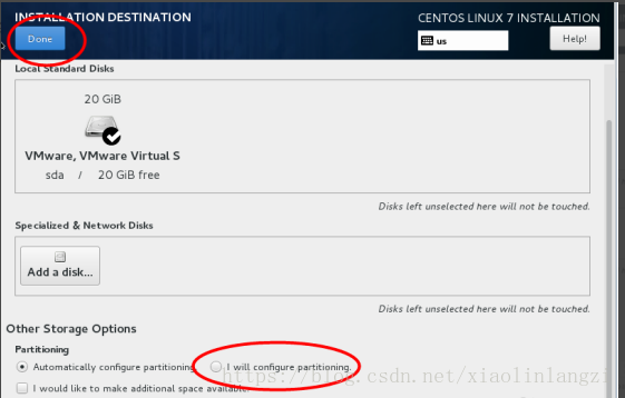 選擇-系統SYSTEM-安裝位置INSTALLTION DESTINATION,進入磁盤分區界面,如下圖所示: