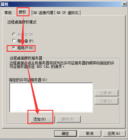 4、點擊“關閉”。在“授權”選項下選擇“每用戶”,點擊添加,然后把本機添加進去