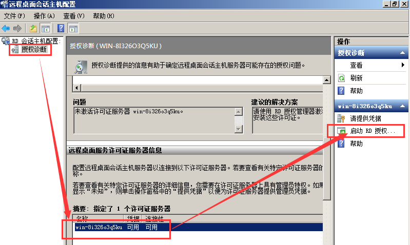 注意:一定要激活該服務,如果不激活的話,遠程桌面連接最多使用120天,點擊“授權診斷”,“摘要下邊可以看到我們添加的“授權服務器”,點擊右側的“啟動RD授權管理器”。