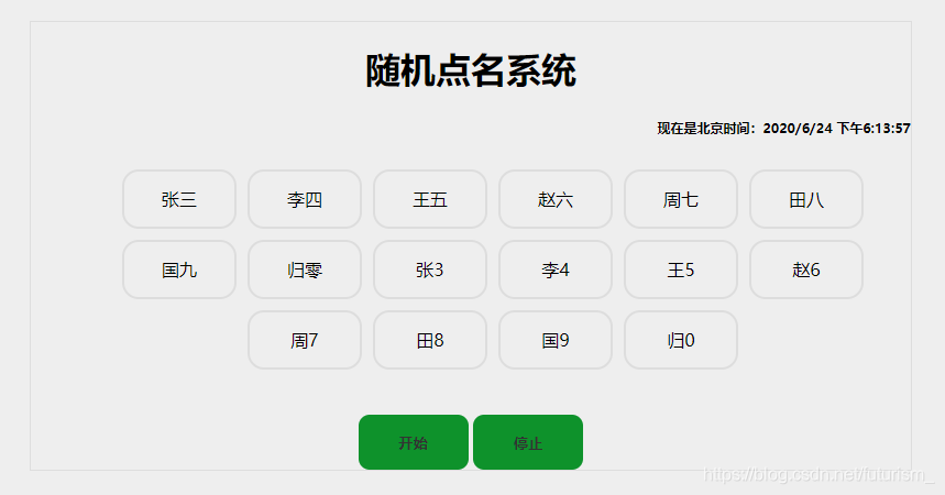 到此這篇關于html實現隨機點名器的示例代碼的文章就介紹到這了,更多相關html隨機點名器內容請搜索腳本之家以前的文章或繼續瀏覽下面的相關文章,希望大家以后多多支持腳本之家!