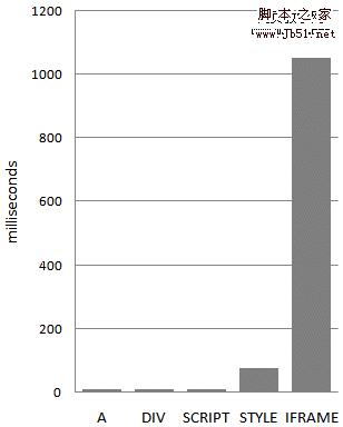 使用 iframe 可以輕易的調(diào)用其他網(wǎng)站的頁面,但應(yīng)謹(jǐn)慎使用。它比創(chuàng)建其他 DOM 元素(包括 style 和 script)多耗費(fèi)數(shù)十甚至數(shù)百倍的性能。增加100個(gè)不同元素的時(shí)間對(duì)比顯示 iframe 是多么耗費(fèi)性能: