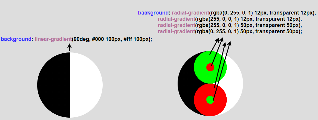 其實太極圖就是由多個不同顏色的圓組成,這里堆疊多個不同的 div,并且把他們組合在一起肯定是 OK 的。但是我們的目標是使用單個標簽完成。