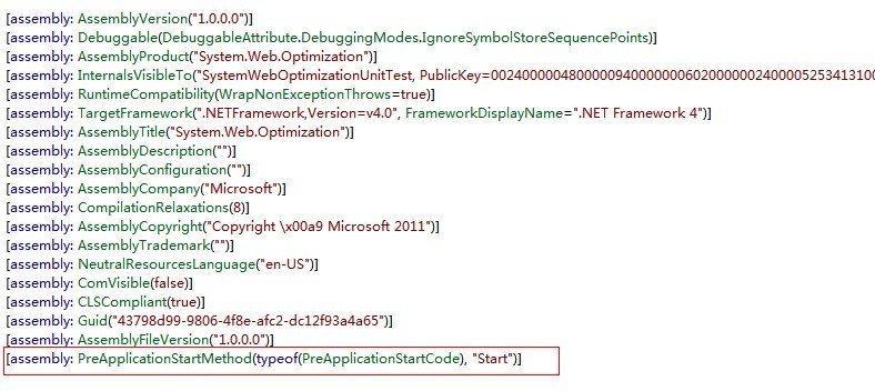 Bundle的連接地址,雖然它在HTTP的管道中;找到它就好順藤摸瓜了,但是奇怪的是我在Web.config里沒有發現它的配置信息,奇怪了,難道它還跑去系統文件改,當然是不可能的;所以我一時還想不起能有什么辦法動態注冊,提起動態注冊突然有了思路,好像有一個Assembly級別的特性用來注冊Application_Start啟動時候的前置代碼,會在Application啟動之前執行,來看一下;