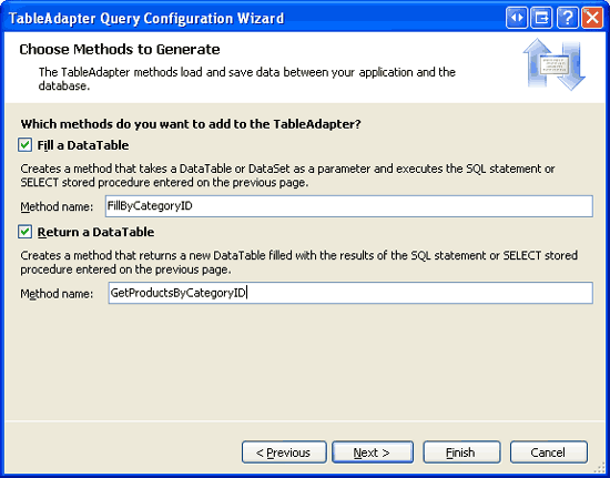 然后需要指定采用的方法模式以及方法的名稱.同時選中Fill a DataTable” 和 “Return a DataTable”項.將這2個方法重命名為FillByCategoryID和 GetProductsByCategoryID. 點Next,確認無誤的話,再點Finish完成設置。