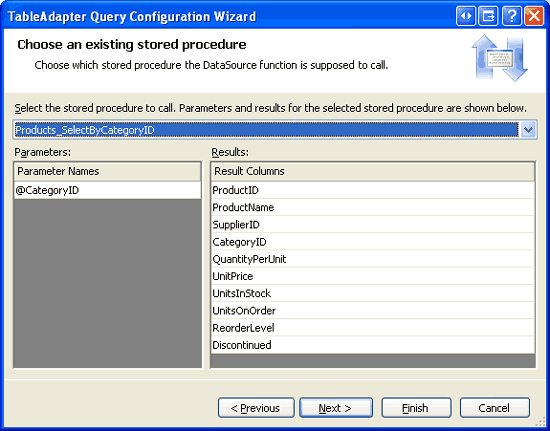 注意:我們剛才添加FillByCategoryID 和 GetProductsByCategoryID方法,執行一個int類型的輸入參數,它由@CategoryID傳遞進來。如果你要改動Products_SelectByCategory存儲過程的參數的話,你也必須更新這些TableAdapter方法的參數.就像在前一篇文章探討的一樣,要么手動添加或刪除參數集里的參數,要么再次運行TableAdapter向導.