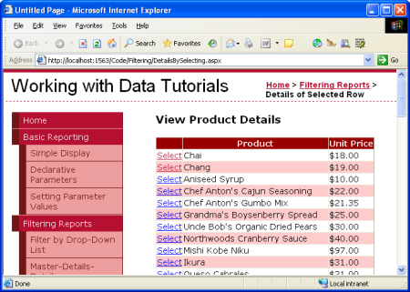 在前面的教程我們看到了如何使用兩個頁面(一個主頁,用于列出供應商; 一個明細頁,用于顯示選定供應商提供的產品)創建主/從報表 . 這種兩個頁面的報表格式也可以集中在一個頁面上. 這篇教程將會使用一個GridView, 它的每一行都包含產品的名稱和單價以及一個選擇按鈕. 單擊一個產品的選擇按鈕會在同一頁的DetailsView控件上顯示該產品的全部詳細信息.