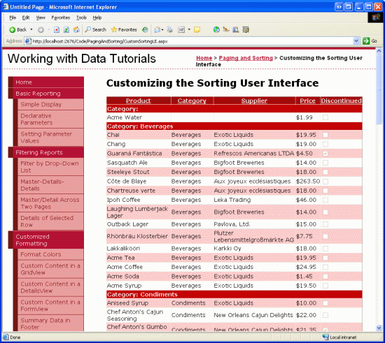 顯示大量已經按類別(不是很多)排序的數據但沒有類別分界線,用戶很難找到所需要的類別。例如,數據庫中只有9個類別(8個不同的類別和1個null),共81種產品.現在用一個GridView列出所有產品,假設有用戶對類別Seafood的產品感興趣,她一定會按類別排序,把Seafood產品排列在一起.排序后,用戶便尋找Seafood產品開始和結束的地方。雖然是按英文字母排列類別不難找到Seafood,但仍要花些時間在GridView尋找。為了進一步的區分類別,許多網站使用類別分界線這種排序用戶界面來區別不同的類別。例如像圖1中的分界線可以使用戶很快地找到需要的類別。