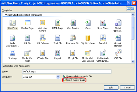 圖5:添加一個新Web Form并且勾上“選擇母板頁”的復選框