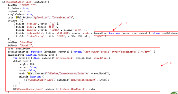 這個是初始化datagrid。其中1是使用Common.js中的jsonDateFormater方法格式化日期。2、就是詳細視圖部分
