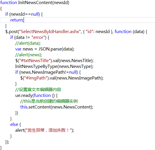 首先在頁面加載時獲取到新聞的id,然后再進行ajax查詢,查詢新聞封裝在了一個handler中,向這個handler發起ajax請求,請求參數為新聞id,獲取新聞,獲取到之后,把新聞的內容設置給ueditor
