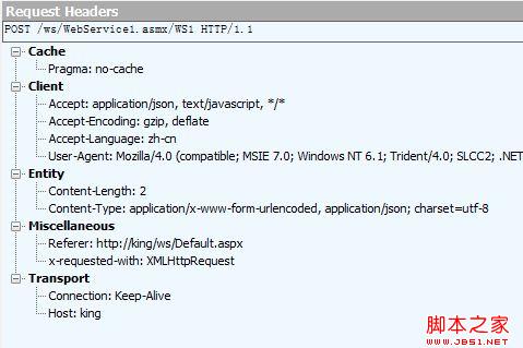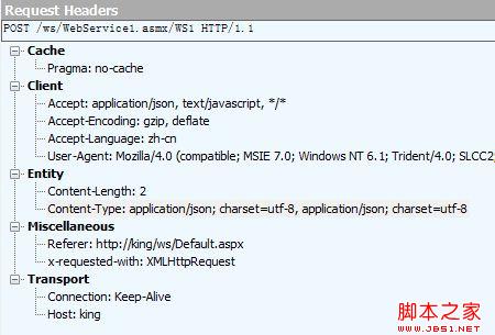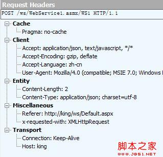 那么在IE發(fā)送的Requst Headers就如下圖所示,你會看到Content-Type有兩個用逗號隔開的值,這是為什么呢?因為,jquery為Content-Type設(shè)置了一次值,我們手工又設(shè)置一次,而在IE是多次設(shè)置Content-Type的值它會追加,而不是替換,不過這并不影響WebService正確返回 JSON數(shù)據(jù)給我們,不過應(yīng)該避免這種情況出現(xiàn)。