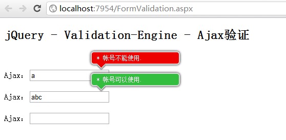 本文主要內(nèi)容是:在ASP.NET中實(shí)現(xiàn)AJAX驗(yàn)證功能。官方給出的Ajax驗(yàn)證例子是PHP的實(shí)例,筆者在網(wǎng)站查閱的資料基本都是翻譯的官網(wǎng),在ASP.NET中實(shí)現(xiàn)普通驗(yàn)證是沒有問題的。但是,不能實(shí)現(xiàn)Ajax驗(yàn)證,這應(yīng)該是個(gè)bug。筆者研究了插件代碼,給出我自己的一種解決方案,要在ASP.NET實(shí)現(xiàn)這種效果,必須修改官方的主JS文件,當(dāng)然同學(xué)們可以根據(jù)筆者的思路進(jìn)行挖掘,歡迎補(bǔ)充!實(shí)現(xiàn)效果見下圖: