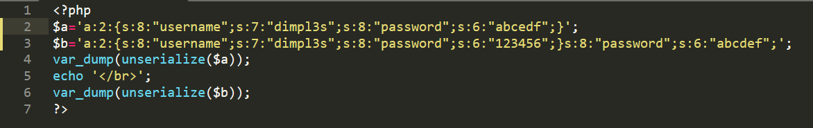$b='a:2:{s:8:"username";s:7:"dimpl3s";s:8:"password";s:6:"123456";}s:8:"password";s:6:"abcde";}';