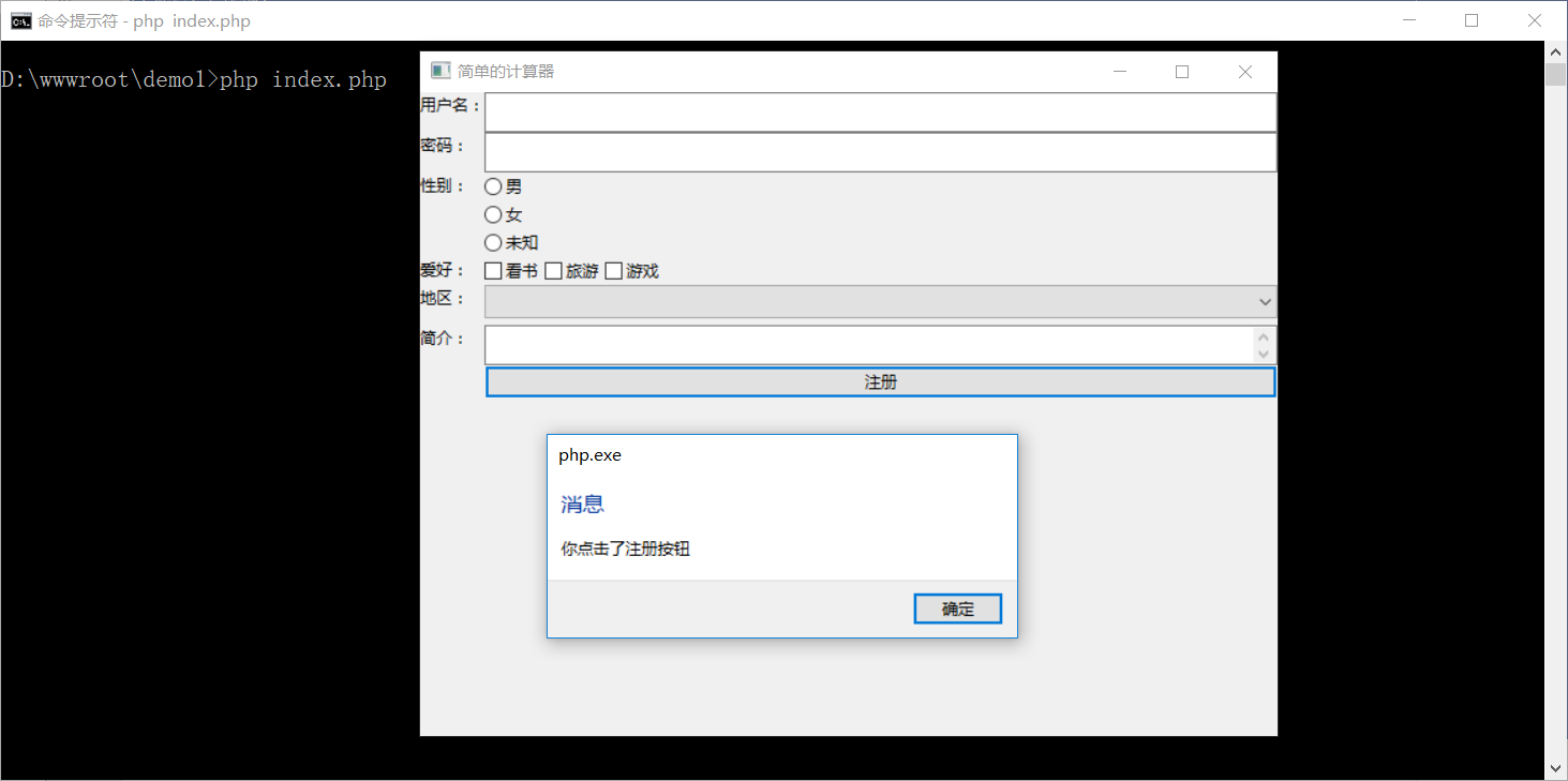 $this->win->msg('消息', '你點擊了注冊按鈕');