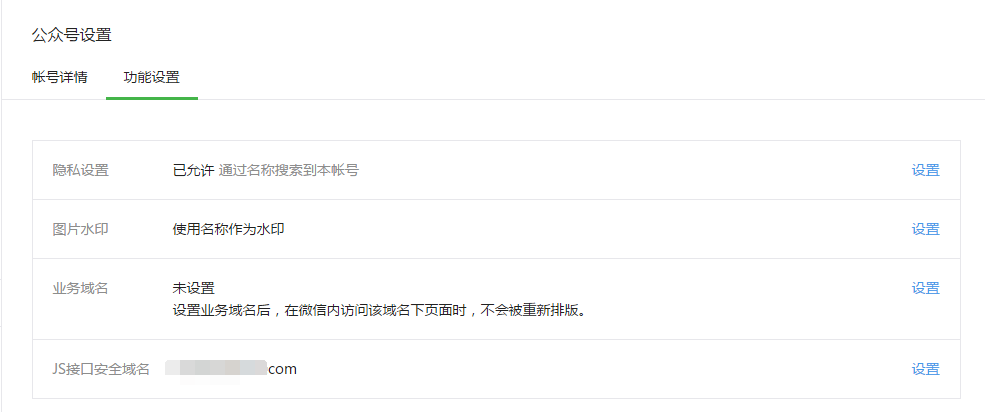 3、 在公眾號設置-功能設置標簽中,設置JS接口安全域名,這個域名在認證獲取token的過程中可能會用到。但具體如何使用目前我也不是特別的清楚,只是按照大家的思路配置完事。
