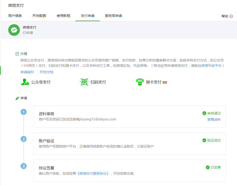 1、 你的公眾號,在支付認證的標簽下, 內容應該和下圖類似。證明公眾號已經完成了認證和合約的簽署。