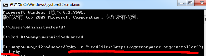 cmd dos命令進入這個D:\wamp\www\yii2\advanced下: