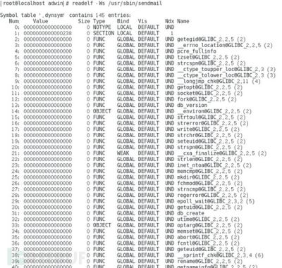 使用readelf -Ws /usr/sbin/sendmail命令來查看,我們發現sendmail函數在運行過程動態調用了很多標準庫函數,我們從中隨便選取一個庫函數geteuid進行測試。