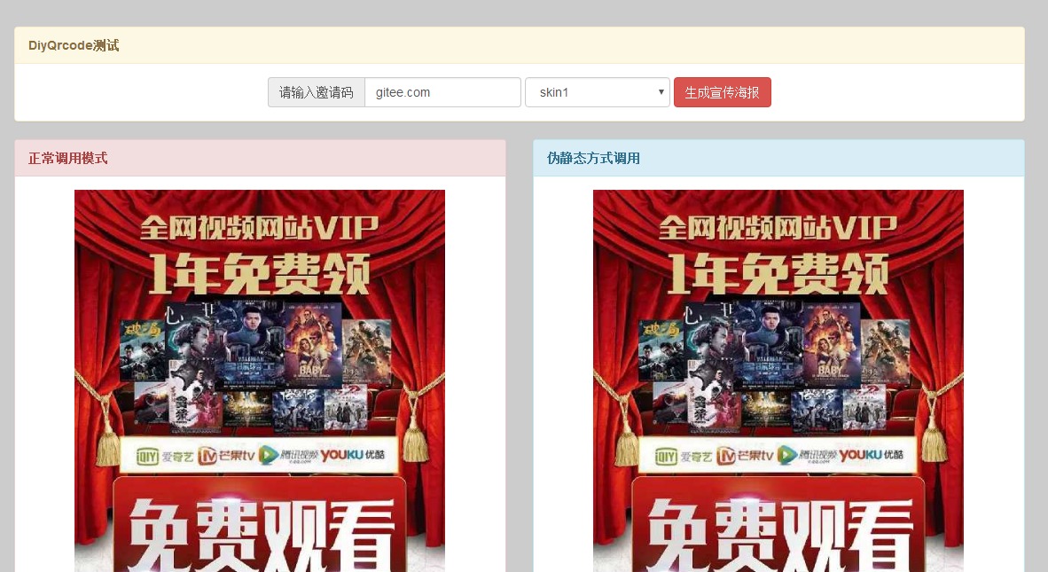 * 模版路徑說明:(以安裝路徑 /vendor/qrcode-diy/,域名為 http://localhost/ 為例)