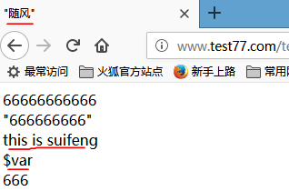 ?php $var = 'this is suifeng'; echo 'EOT' !DOCTYPE html> html> head> meta http-equiv="Content-Type" content="text/html; charset=utf8" /> title>"隨風"/title> /head> body> '02020'br/> \'br/> 66666666666br/> "666666666"br/> $varbr/> \$varbr/> \n666br> /body> /html> EOT;