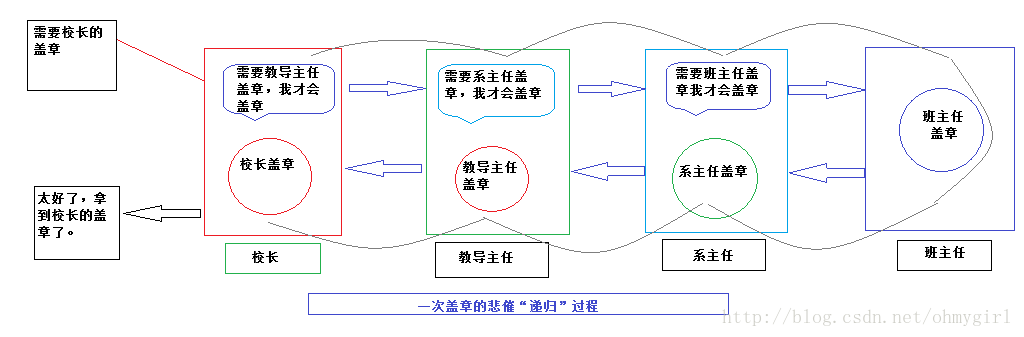 遞歸(http:/en.wikipedia.org/wiki/Recursive)是一種函數調用自身(直接或間接)的一種機制,這種強大的思想可以把某些復雜的概念變得極為簡單。在計算機科學之外,尤其是在數學中,遞歸的概念屢見不鮮。例如:最常用于遞歸講解的斐波那契數列便是一個極為典型的例子,而其他的例如階層(n!)也可以轉化為遞歸的定義(n! = n*(n-1)!).即使是在現實生活中,遞歸的思想也是隨處可見:例如,由于學業問題你需要校長蓋章,然而校長卻說“只有教導主任蓋章了我才會蓋章”,當你找到教導主任,教導主任又說:“只有系主任蓋章了我才會蓋章”...直到你最終找到班主任,在得到班主任豪爽的蓋章之后,你要依次返回到系主任、教導主任、最后得到校長的蓋章,過程如下:
