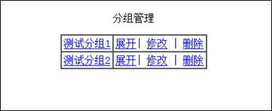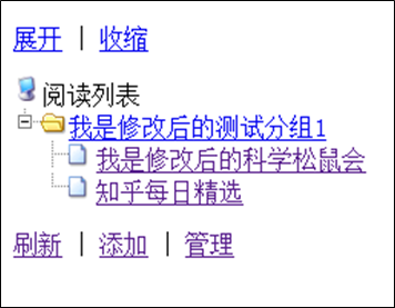 管理界面屬于新的彈窗,初始顯示用戶的所有分組,每個分組包含"展開"、"修改"和"刪除"三個菜單。點擊分組名或"展開"菜單將會跳轉到該分組下的RSS源列表。RSS源列表與分組列表相識,每個分組包含"修改"與"刪除"兩個菜單。