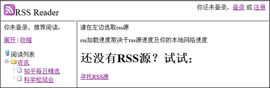 使用閱讀器之前需要注冊用戶并登錄,服務器會保存用戶的RSS列表數據。未登錄之前閱讀器會推薦閱讀閱讀列表,并指導用戶尋找RSS源,如下圖: