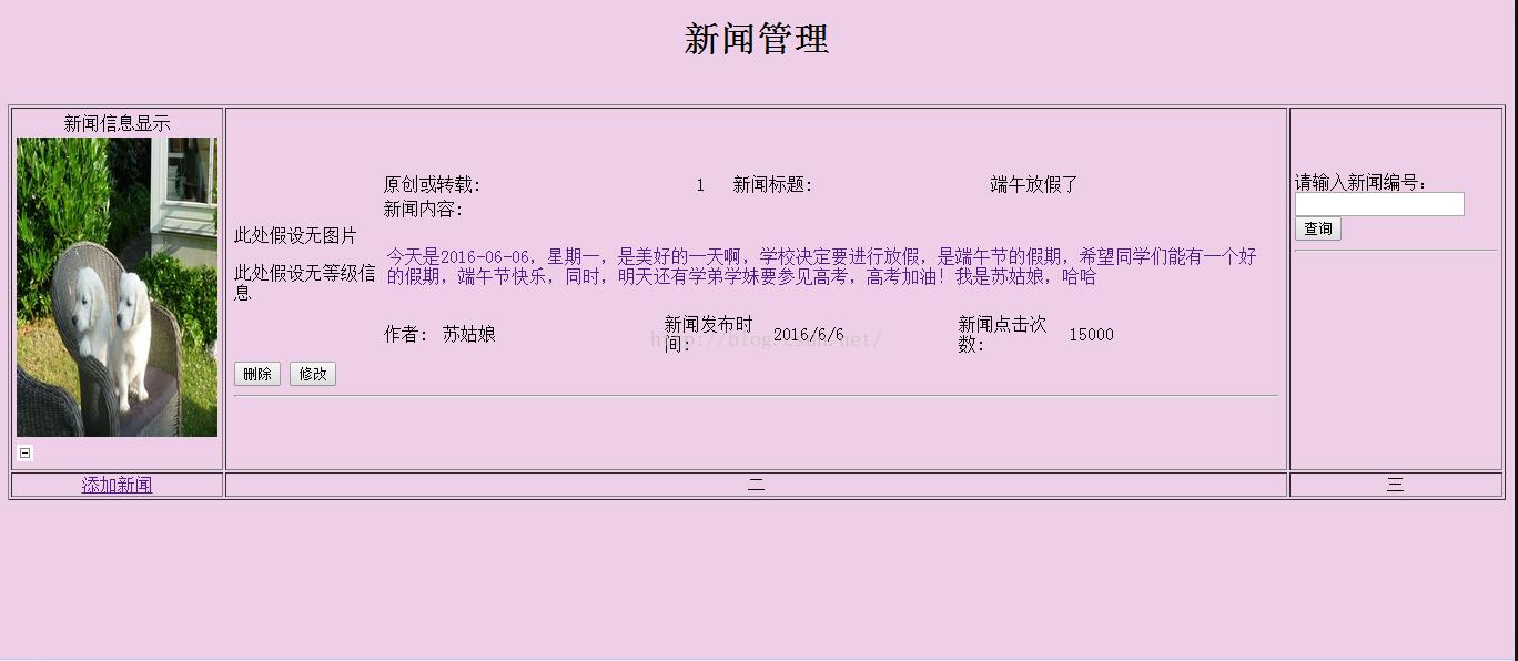對于新聞的查找,與其他類似,在這里我們使用的是利用新聞編號進行查詢所需的信息,然后在新的頁面上進行顯示。