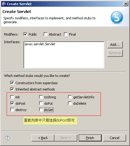 下一步選擇新建的類的屬性,通常選擇默認(rèn)即可。 不過我們的Servlet只需要處理POST方法,所以下方的重載列表中只需選擇doPost即可。