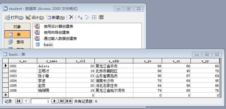 例如有如下的Access數(shù)據(jù)庫student,表basic,以及6條記錄,現(xiàn)在通過幾種方式在Jsp中將他們的數(shù)據(jù)顯示出來。如圖所示: