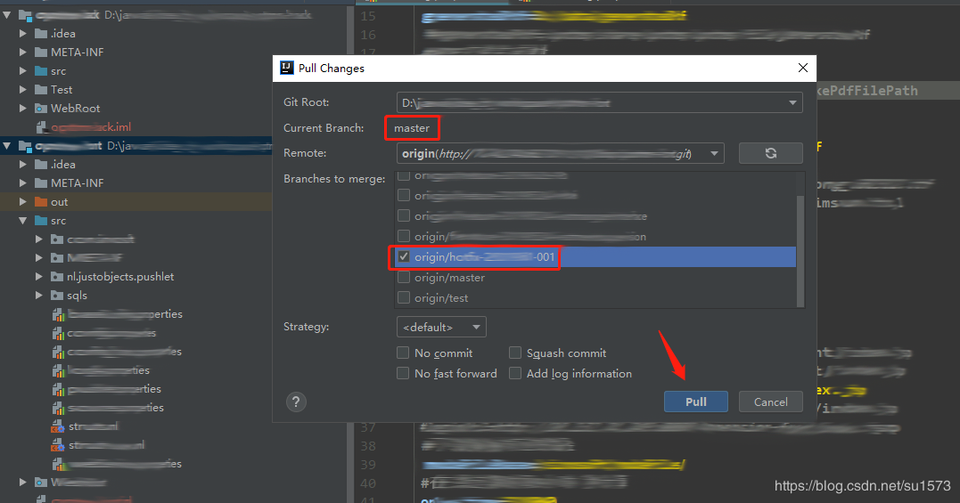 2.1.2. 在更新代碼的時候,選擇001分支代碼,合并到當前分支master,點擊Pull