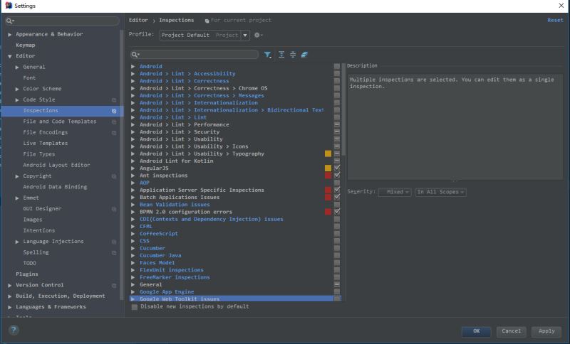 IntelliJ的代碼檢測功能非常強大,但也占用了一些資源,可以將默認的除 Error之外的其他級別的檢測都去掉