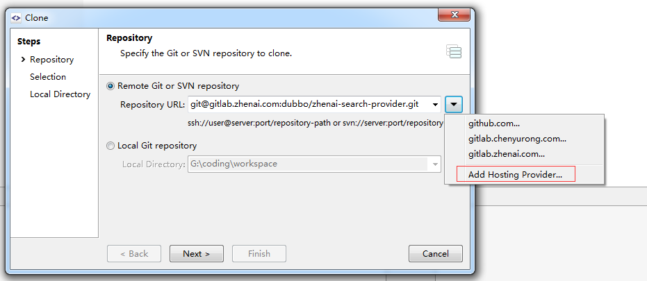 當配置完成后,下次在clone項目的時候就可以看到對應的Providing Hosts選項。