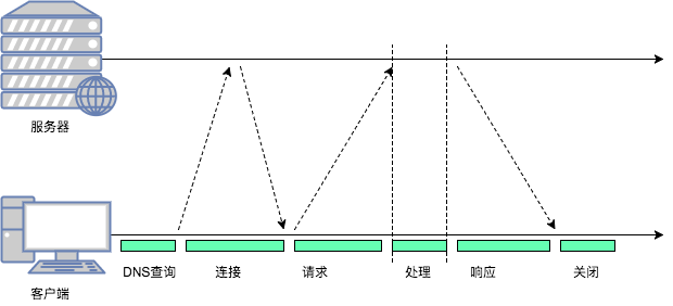 從上面的圖中可以看出,一次正常的交互需要經過DNS查詢、握手、揮手等與數據傳輸無關的操作。如果每次傳輸的數據都很少,那么這種操作所占用的比例就會增加,這將大大降低HTTP的性能。由于HTTP是建立在TCP連接的基礎上的,所以握手的過程是對HTTP不可見的,HTTP只能看到建立連接發生了時延。三次握手的過程這里不做贅述,感興趣的請查閱相關資料。