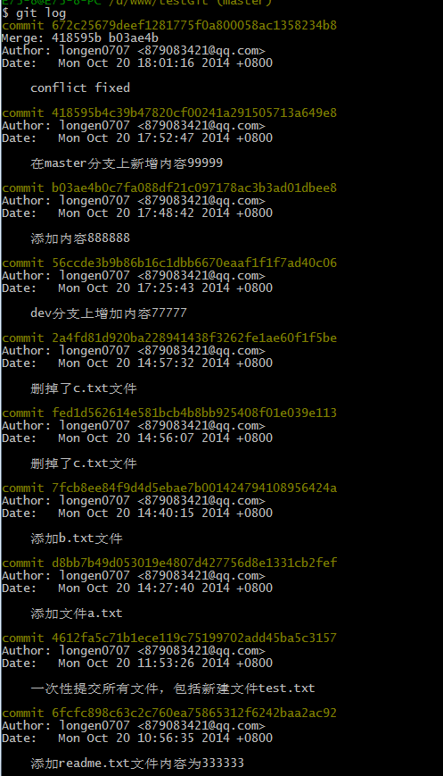 現在我已經對readme.txt文件做了三次修改了,那么我現在想查看下歷史記錄,如何查呢?我們現在可以使用命令 git log 演示如下所示: