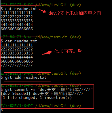 下面我們還是一步一步來,先新建一個新分支,比如名字叫fenzhi1,在readme.txt添加一行內容8888888,然后提交,如下所示: