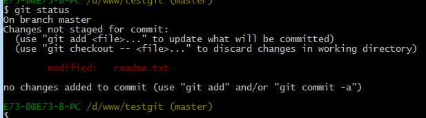 我們在readme.txt再添加一行內容為4444444,接著在目錄下新建一個文件為test.txt 內容為test,我們先用命令 git status來查看下狀態,如下: