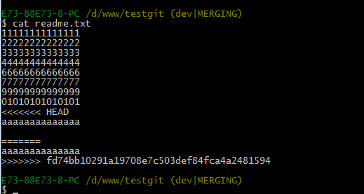 Git用,=======,>>>>>>>標記出不同分支的內容,其中HEAD是指主分支修改的內容,>>>>>fenzhi1 是指fenzhi1上修改的內容,我們可以修改下如下后保存: