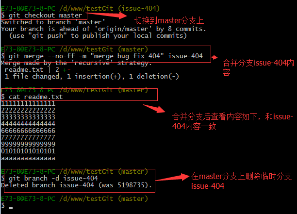 修復完成后,切換到master分支上,并完成合并,最后刪除issue-404分支。演示如下: