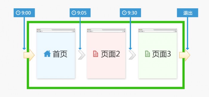 有人訪問了你的網站主頁,你的網站分析工具則開始為這個訪問者計1個Session(會話)。接著這個訪問者又瀏覽了另外兩個頁面,然后離開了你的網站(離開網站可以是通過關閉瀏覽器,或在地址欄鍵入一個不同的網址,或是點擊了你網站上鏈接到其他網站的鏈接……)為了簡單點,我們把這個過程當做一個Session。