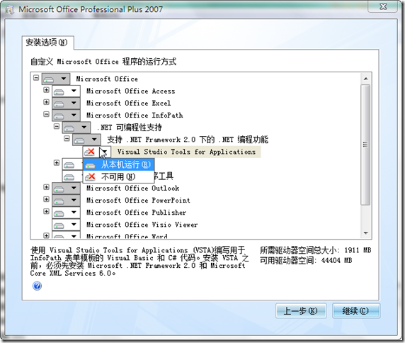 使用自定義驗證事件需要編寫C#代碼進行數據的有效性驗證,因為Infopath內置了VSTA編程接口,使得我們可以非常方便地通過Visual Studio為Infopath編寫C#代碼以完成一些特定的功能。在這里要注意一下,編寫本文時我本機的開發環境是Visual Studio 2008 + Office 2007,在安裝Office 2007時必須手動將Infopath項下的VSTA選項勾上,否則Infopath默認是不支持VSTA編程接口的。Infopath中的VSTA默認使用的Visual Studio 2005的開發環境,讀者不需要特定去安裝Visual Studio 2005,默認情況下VSTA會將所需的程序及環境配置好。