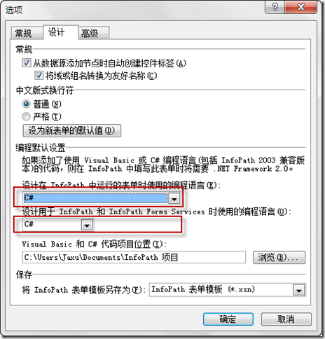 右鍵單擊要設置數據有效性驗證的控件,選擇“編程”-“Validating事件”,此時Infopath會聯系Visual Studio打開VSTA工程,在VSTA工程中,我們可以為事件添加自定義方法。有一個地方需要說明,默認情況下Infopath會以VB.NET語言創建VSTA工程,如果你想更改工程語言,可以點擊“工具”-“選項”,在“設計”選項卡中將語言選為C#,同時你還可以設置工程的默認保存位置。如果之前你已經創建了VB.NET語言的VSTA工程,可以通過“工具”-“表單選項”,在“編程”選項卡中刪除代碼,然后重新創建新的VSTA工程,在此處也可以選擇本Infopath表單的VSTA工程的存放位置。