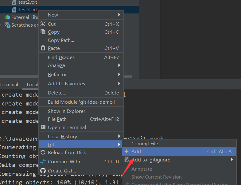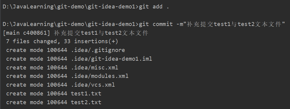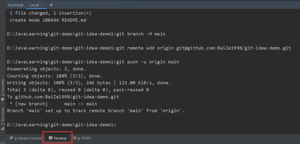 此時依舊在git-idea-demo1的文件夾內,在下方的終端輸入處輸入上述所有的命令,結束之后結果應該與下圖相同
