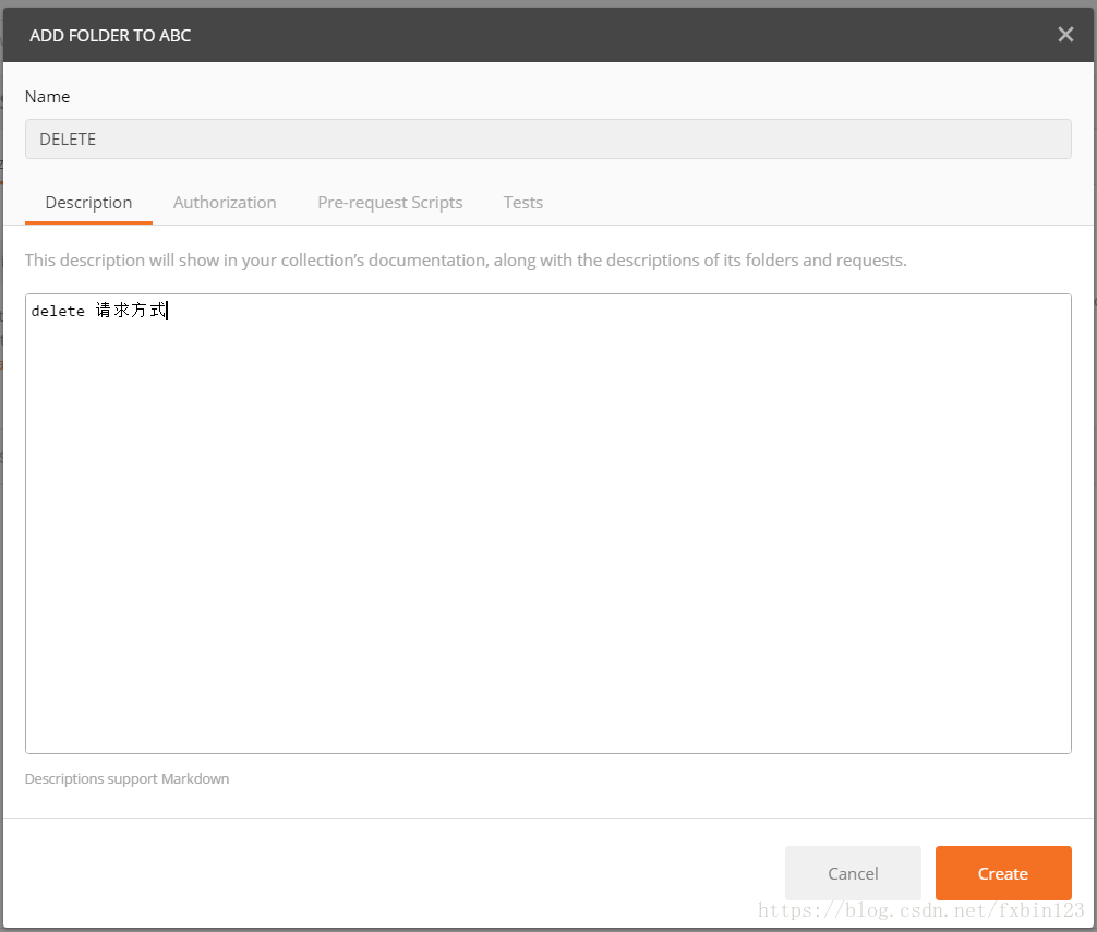 點擊上圖中的帶+號的圖標,輸入Name:”abc”,Description:”示例demo”,點擊Create按鈕即創建成功一個Collections.