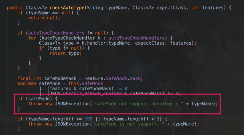 可以看到,這些漏洞的利用幾乎都是圍繞AutoType來的,于是,在 v1.2.68版本中,引入了safeMode,配置safeMode后,無論白名單和黑名單,都不支持autoType,可一定程度上緩解反序列化Gadgets類變種攻擊。