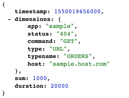在我們的用例中,數據具有一個固定的維度鍵(11 維),一個時間戳和兩個要計算的度量:計數和延遲。計數是在特定時間戳收集數據時主機發生的事件數量。延遲表示所有事務的延遲總和。跨應用程序的數千個主機可能會生成數以百萬計的事件,每個事件可以包含不同的緯度值集。每個應用程序的每個維度的緯度值可以從十到幾千不等。